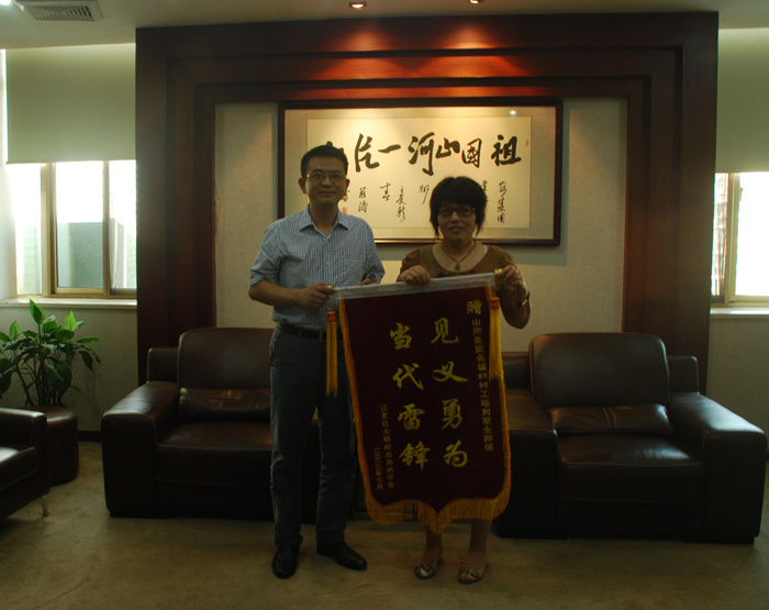 圖為集團(tuán)公司副總經(jīng)理兼湖北公司總經(jīng)理林中茂(左)接受郭琴香(右)贈(zèng)送的錦旗