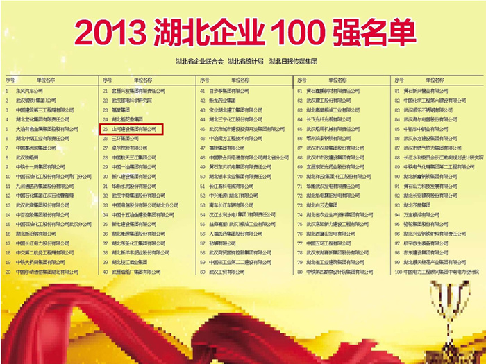 10月22日,2013湖北企業(yè)百強發(fā)布會、第十八屆湖北省優(yōu)秀企業(yè)、優(yōu)秀企業(yè)家表彰大會暨八屆二次會員代表大會隆重舉行。湖北省企業(yè)聯(lián)合會、湖北省統(tǒng)計局和湖北日報傳媒集團(tuán)聯(lián)合發(fā)布了2013湖北企業(yè)100強名單,山河集團(tuán)位列湖北百強企業(yè)第25位并榮獲“第十八屆湖北省優(yōu)秀企業(yè)(金鶴獎)”。山河集團(tuán)董事長程理財同時被湖北省企業(yè)聯(lián)合會和湖北省企業(yè)家協(xié)會聯(lián)合授予“第十八屆湖北省優(yōu)秀企業(yè)家(金牛獎)”榮譽稱號。