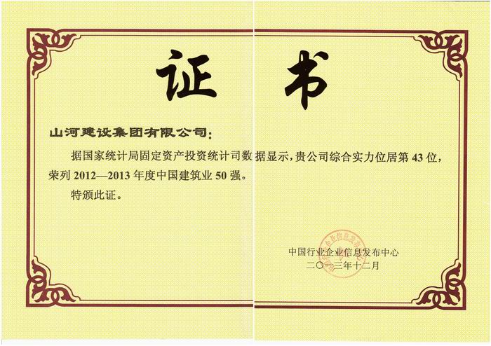 由國家統(tǒng)計(jì)局提供最新權(quán)威數(shù)據(jù)支持,中國行業(yè)企業(yè)信息發(fā)布中心主辦的“2013第十二屆中國建筑業(yè)50強(qiáng)測評成果發(fā)布暨頒獎(jiǎng)典禮”于201312月在京舉行。會上發(fā)布了中國建筑業(yè)50強(qiáng)名單,山河集團(tuán)位居第43名,提前兩年實(shí)現(xiàn)了山河集團(tuán) “二五”目標(biāo)中的該項(xiàng)指標(biāo)。