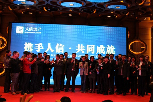 上圖為人信地產(chǎn)總裁辦領導與獲獎供方共同祝酒