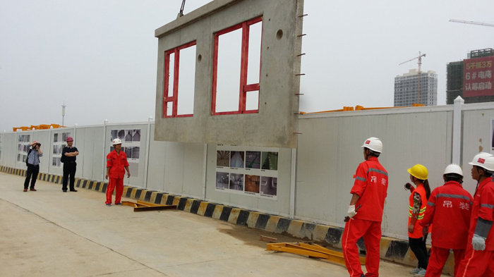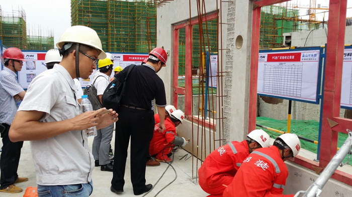 通過項(xiàng)目部數(shù)月的籌劃,南昌萬科海上傳奇項(xiàng)目PC實(shí)驗(yàn)樓于2014年5月26日正式開始吊裝。吊裝前我項(xiàng)目部專業(yè)吊裝人員分別將吊具、調(diào)節(jié)腳碼、斜支撐、鋼絲繩、攬風(fēng)繩、鋼扁擔(dān)等安裝輔助工具準(zhǔn)備就位,依據(jù)技術(shù)交底內(nèi)容、項(xiàng)目部的統(tǒng)籌安排及指揮,按照制定的PC吊裝時(shí)間行程,將實(shí)驗(yàn)樓的PC構(gòu)件一次順利吊裝成功并調(diào)試合格。