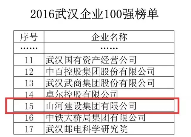 8月31日上午,2016武漢企業(yè)“雙百強(qiáng)”暨“雙十”發(fā)布會(huì)在武漢國際會(huì)展中心召開。會(huì)上發(fā)布了“雙百強(qiáng)”及“雙十”企業(yè)名單,山河集團(tuán)榮列武漢企業(yè)100強(qiáng)第15位、武漢民營企業(yè)100強(qiáng)第3位。