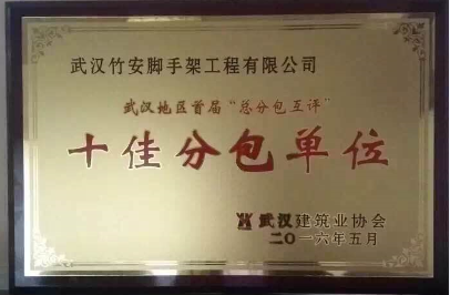 今日,武漢建筑業(yè)協(xié)會(huì)組織的武漢地區(qū)首屆總分包互評(píng)活動(dòng)在光谷金盾大酒店舉行頒獎(jiǎng)儀式,武漢竹安設(shè)備管理有限公司及控股子公司武漢竹安腳手架工程有限公司以其雄厚的技術(shù)實(shí)力和良好的聲譽(yù),雙 雙獲評(píng)“十佳分包單位”。