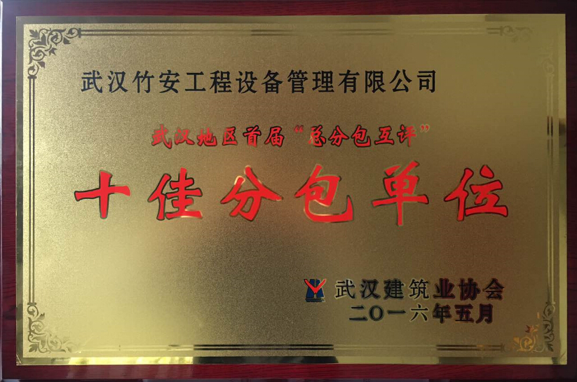 [竹安設(shè)備]竹安公司榮獲武漢地區(qū)首屆總分包互評(píng)“十佳分包單位”