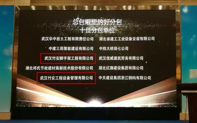 今日,武漢建筑業(yè)協(xié)會在光谷金盾大酒店三樓舉行2015年總分包互評頒獎典禮活動。山河集團獲頒“十佳總包”,集團旗下公司竹安腳手架與竹安設(shè)備則獲頒“十佳分包”,雙雙上榜。
